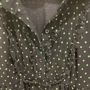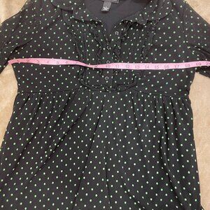 This INC Polka Dot Blouse is a stylish and versatile top. Featuring a flattering babydoll silhouette with ruffle accents and a collared neckline, this long-sleeve blouse is made from a comfortable nylon fabric. The black with green polka dot pattern adds a playful touch, while the pullover closure makes it easy to wear. Ideal for travel, parties, casual outings, workwear, and business settings, this blouse is a must-have addition to any woman's wardrobe.