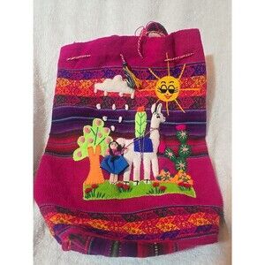The Inca Peruvian Small Backpack is a beautifully handcrafted wool blend knapsack purse featuring intricate embroidery of an alpaca girl in the sun. With a nature scene pattern and shoulder straps handle style, this medium-sized backpack is perfect for travel, casual outings, and workwear. The multi-color design and lightweight construction make it a versatile and stylish accessory, showcasing the rich cultural heritage of Peru and the charm of nature themes. Made with care and attention to detail, this backpack is a unique and practical choice for those who appreciate artisan craftsmanship and nature-inspired designs.