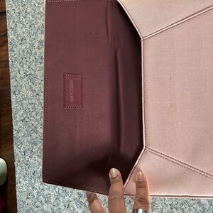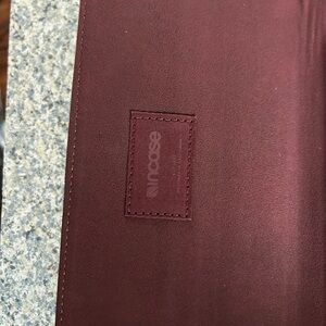 Protective slim tech sleeve by Incase. Soft maroon exterior with subtle stitched logo patch. Fits laptops and tablets securely. Minimal, professional look.
