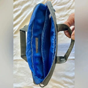 In great condition. No stains or tears noted. Can hold up to a 13 inch laptop. Has a strap for over the shoulder use and handles that fold in. Inside two pockets one for laptop and another for paperwork if needed. Side zipper for easy, charging capability.