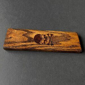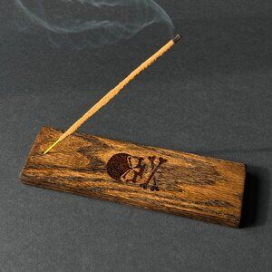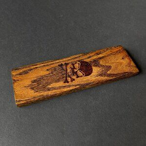 This unique handcrafted wooden incense holder is features a skull and crossbones design etched into the wood. The dark, dramatic stained oak wood grain contrasts beautifully with the burnt pyrography design, giving it a rich, vintage, and slightly macabre aesthetic.