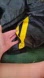Inner vest attaches to shell by Velcro at 3 different points. Vest is quilted, yellow stripe detail at the neck and lining 2 front pockets. Has a hideaway pocket on the inside. 100% polyester. Shell is zip and button front. Yellow detail around the neck and down front zipper as well as lining front pockets. Some minor smudges on inside yellow. 65% polyester 33% rayon 2% spandex