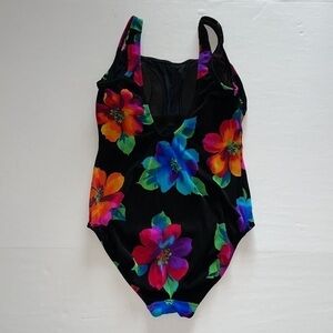 Inches Away black vivid floral scoop back one piece swimsuit. Size tag has been removed. Measures M. 27 1/2” shoulder to mid crotch. 15” across bodice laid flat. 13 1/2” across waist laid flat. 15 1/2” thigh to thigh laid flat. Gently used condition