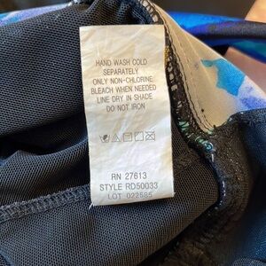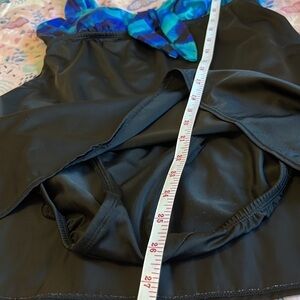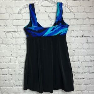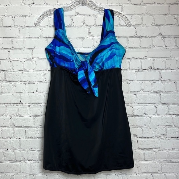 Inches Away by Longitude Swimwear Tie Front V-Neck Swim Dress Swimsuit in bright blue print with black dress. Inches Away swimsuits will always support you best and give you the perfect fit, the highest quality fabrics and the most variety of coverage options to suit your needs. This is the brand name quality you deserve without that same brand name cost.