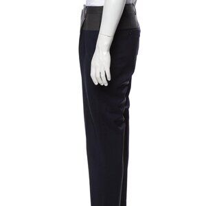 These are pleated wool dress pants in a slim tapered fit. Color-blocked with grey on top and navy blue fabric below.