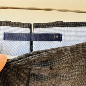 Features: zipper closure, pockets , woven wool fabric in light brown /gray color, slim fit