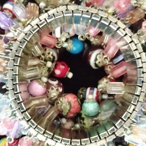 The pictures do not do it justice. It really is a showstopper with the multitude of assorted beads. The rectangular shapes of the outside connectors show sturdy attachments to beads. The inside rectangles are used to help provide the stretch. There is a bohemian, artistic and tribal feel to its look. This is a vintage piece. There are so many beads, and I cannot tell if any beads are missing. It is in beautiful condition and will be quite the conversation piece for your jewelry collection. Expect to receive many compliments!
