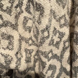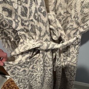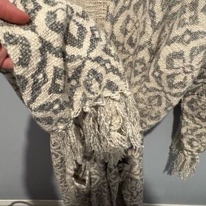 Stylish knit cardigan with a fringed design. Features a unique pattern in cream and gray tones. Perfect for layering.