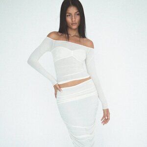 Coco solid long sleeve pinch-bra bodycon top in Ivory. We are obsessed with this super classy sheer-ish top with a lined/double layer bralette detail & matching ruched skirt. Created with a recycled, eco-conscious Mesh Soul Eco; a gorgeous second-skin, wet-look layer of fabric with the perfect amount of stretch. The perfect amount of stretch, this piece is created with the same textile as our iconic JLO dress. The full look is perfect for events and nights out, but we love to pair this top with our favorite denim, too. This top runs small. We recommend sizing up. Lifestyle model Steph wears size S. Studio model Lente wears size XS.