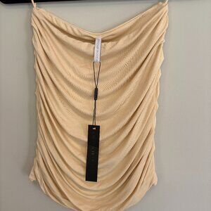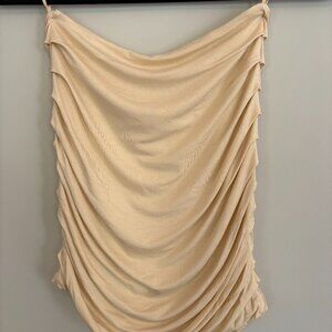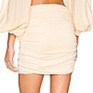 Ordered originally from Revolve. 90% viscose, 10% spandex. Made in Indenosia. Machine wash. Double lined. Pull-on styling. Soft jersey fabric with ruched sides. Item not sold as a set. Skirt measures approx 14" in length.