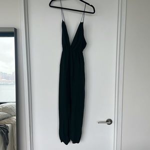 Indah jumpsuit in a dark teal color. Adjustable straps with super cute shells at the ends. Back is fairly open, low cut front. Photo of jumpsuit on model pictured in different color so you can see the legs. Great for vacation. Small seam tear on one of leg openings, but I don’t know how to sew!