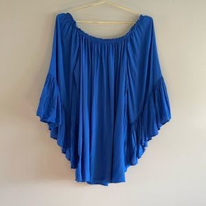 Featuring elasticized off the shoulder neckline, ruffled/bell cuffs, and shift style design, material is thin, but very soft; perfect for beachy days.