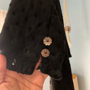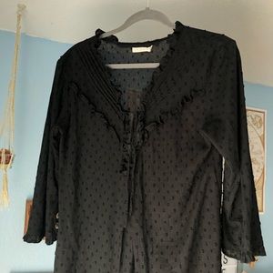 Indah ruffle dress in black! Features a drawstring tie at neckline and two cute buttons on sleeves. This gorgeous dress is sheer. Wear as a cover up or put on a lining under to make it a night out dress!