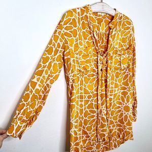 Geometric Orange White Print Long Sleeve with button Cuff Double Chest Pockets 100% Rayon