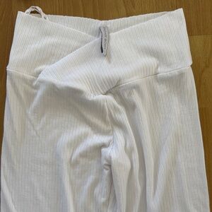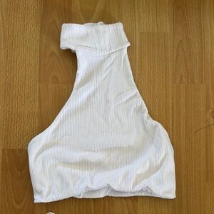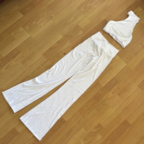 Elegant white jumpsuit set perfect for any occasion. Features high waisted pants with wide waistband and v- detail. High neck halter top with button closure. Size 1 or Small. Never worn