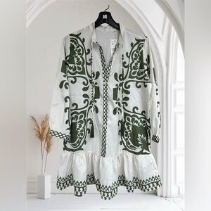 Stylish dress with intricate green patterns on a white background. Features a ruffled hem and long sleeves.