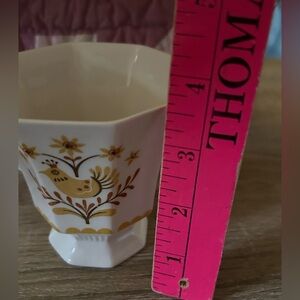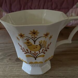 The Independence Ironstone Castleton Mug Cup Vintage is a beautiful and delicate cup featuring a gold/yellow floral and bird pattern. Made by the renowned brand Castleton in Japan, this vintage piece is perfect for all occasions and would make a lovely addition to any table setting. Only 1 cup.