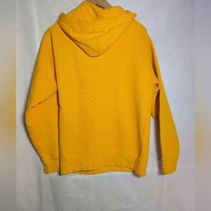 Bright yellow hoodie featuring a unique embroidered graphic design. Perfect for casual wear.