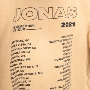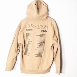 Independent Trading Company Jonas Brothers 2021 tour hoodie in classic streetwear style. Men’s size large. Soft tan cotton-poly fleece with a black front graphic of the band and full 2021 Remember This Tour dates printed on the back. Kangaroo pocket and drawstring hood keep it practical, while the aged print and neutral tone give it that worn-in retro feel fans love.