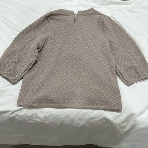 I think it’s one size but it fits like a small/smaller side of medium. Length of sleeves are like quarter sleeves. Cute little pearl hook on the back at the neckline. The color is similar to a nude mauve.