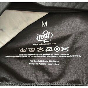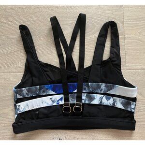 This is the Cross Top in the black ice print by Indi Pole in size M. It has an abstract white/blue/gray print with black mesh details, and black straps.