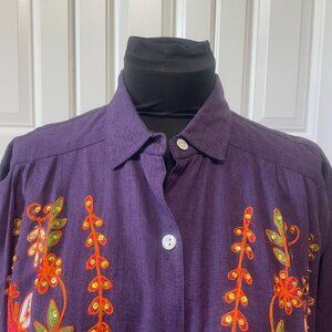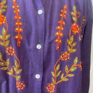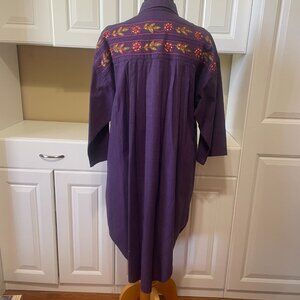 This stunning India Eastern shift dress is perfect for any occasion. With its vibrant floral pattern and colorful accents of beading and embroidery, this dress will make you stand out in any crowd. The dress features a collared neckline, 3/4 kimono sleeves, and a button closure. The pleated shoulders and across back add a touch of elegance to the dress. Made from high-quality cotton fabric, this dress is comfortable to wear and easy to care for with its machine washable properties. This vintage dress is a must-have for any woman's wardrobe.