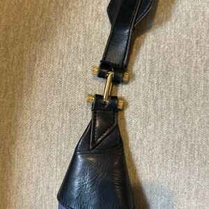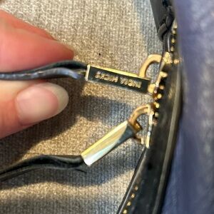 Navy grained leather India Hicks Isabella large hobo with gold-tone hardware, black leather trim, single flat shoulder strap, beige and ivory printed woven lining, three interior pockets; one with zip closure and zip closure at top.