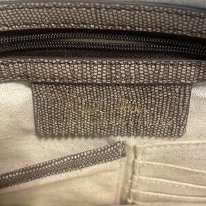 Tags: genuine leather, India hicks, brown, gray, metallic, silver, print