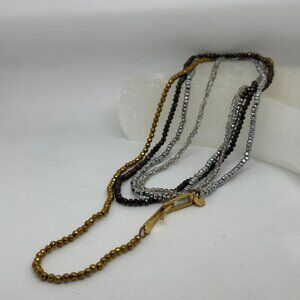 This necklace can be worn as a single, double, triple necklace or wrapped bracelet. Colors are gold/silver/clear/burgandy. It’s very sparkly and festive beautiful colors. India Hicks designer. 61.5” in length.