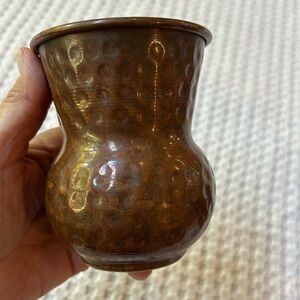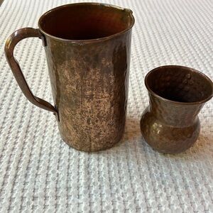 Indian Art Villa Hammered Copper Small Pitcher Cup. Pitcher has handle and is approx 7” high and 4” across. Small spout. Pitcher is not perfectly round —see last photo looking down into pitcher. Cup is 4 1/4” high and 3 1/4” across the top.