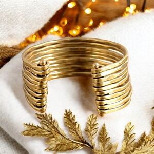 Make a bold, stylish statement with this exquisite handcrafted cuff bracelet! Inspired by Indian artistry and Bohemian flair, this unique piece features layered, wave-textured brass strands forming an elegant, open-ended design. Its warm golden tone and sculptural lines add a luxe touch to any outfit—perfect for elevating casual looks or complementing chic ensembles. A must-have for lovers of artisanal accessories, vintage-inspired vibes, and bold statement jewelry!