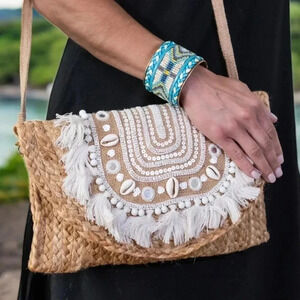 🌸 Elevate your style with this exquisite handcrafted sling bag, made with love by skilled Indian artisans. Featuring bohemian tassels, sea shells, and vibrant colors, it's the perfect blend of artistry and functionality. 🌿 The eco-friendly design, crafted from natural plant fibers, adds a unique touch with delightful variations in color, pattern, and texture. ✨ With a detachable strap and a flip-top magnetic closure, this exclusive accessory combines a carefree boho vibe with everyday practicality. Make a statement with this must-have addition to your collection! 💼