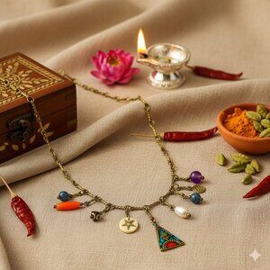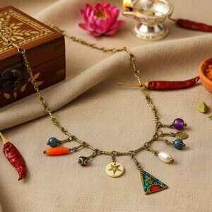 Indian Artisanal Boho Chic Necklace Antique Gold Charms Colorful Accents