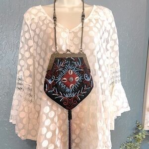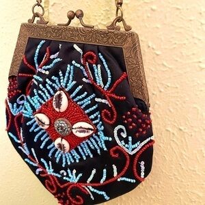 This is a heavy, well-made Indian purse that is in like new condition!! So much detail and just the right size to hold all the essentials. Etched metal trim with beads and rounded braid chain. Long beaded tassel on bottom. Mirror inside that is attached. Genuine Turquoise mosaic center embellishment. Hinged closure. Approximately 9” x 8” plus 7” tassel. 14” drop. Black satin backing. Gorgeous.