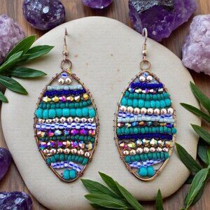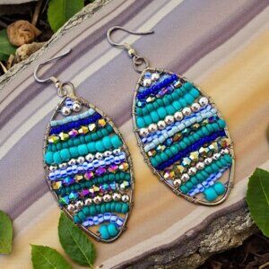 Boho earrings, handmade beaded earrings, Indian artisan jewelry, statement earrings, coastal chic, squash tail earrings, festival style, colorful beaded earrings, ethnic earrings, tribal inspired, turquoise earrings, brass earrings, artisan accessories, beach boho style, gypsy fashion, lightweight dangles, gift for her, artistic jewelry, Poshmark boutique, boutique jewelry, unique jewelry, colorful jewelry, statement jewelry, bohemian