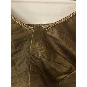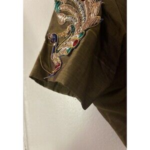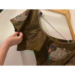 This unbranded Indian Chanderi Olive Silk blouse is a beautifully embroidered and vintage piece, perfect for various occasions such as weddings, parties, and formal events. Handmade with a breathable possible silk blend fabric, this blouse features a hook and eye closure, short sleeves, and a regular fit. The olive color and Indian-themed design make it a stylish and versatile choice for summer, fall, and spring seasons. Made with care this blouse is a unique and artisanal addition to any woman's wardrobe. There is a small stain on lower front left. Some bead string is loose please look at all pictures. Otherwise this is a beautiful unpadded embroidered crop blouse. No tags. Measures like a medium size blouse. Length 12 Arm to armpits 17 sleeves from shoulder 9. Can be used as a summer crop top too. Beautiful work. Thank you for looking!