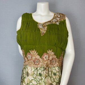 Indian Dress Rhinestones Floral Size XL Green Ruched Top Maxi Floral Embellished