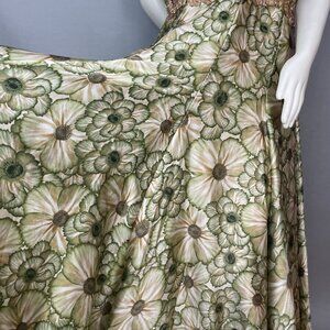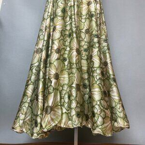 Indian sleeveless dress with green floral full maxi skirt and ruched sleeveless front. Detailed rhinestone embellishments on the neckline and waist. Pull-on style, no zipper or buttons.