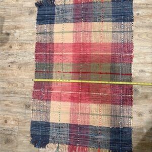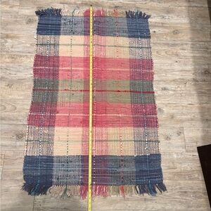 Colorful Indian handwoven rag rug with a plaid pattern. Features wide red and blue blocks with cream and tan accents. Soft textured weave and fringe on ends. Rustic, versatile piece for floor or decor. 50 x 20; GREAT condition!
