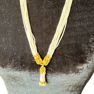 Indian Jewelry Lariat Tassel Necklace, adorned with faux mini pearls, features a leaf design on a gold plated adjustable closure. Its white, beige, and gold color palette adds a touch of elegance.