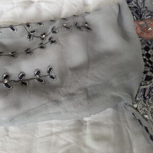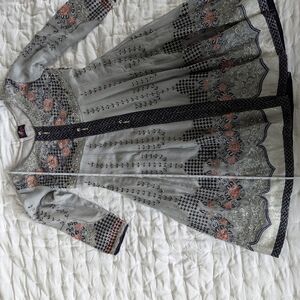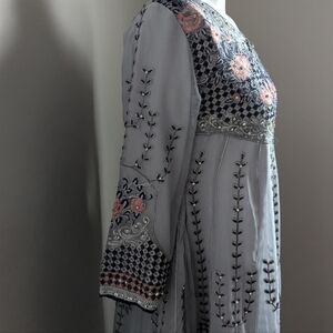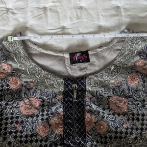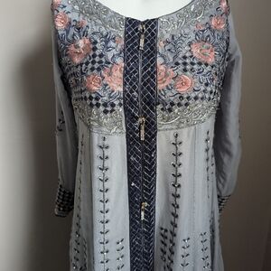 Elegant gray kurta top with floral embroidery. Features pink and black accents.