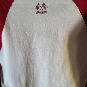 Don't miss this unique Indian Motorcycle shirt. The shirt is white and a deep dark red sleeves. The logos on the front include embroidered "Wrecking Crew" and "Feared, Respected, Unrivaled." The logo at the top of the left sleeve has a small embroidered "Feared, Respected, Unrivaled." The logo at the top of the right sleeve has an Indian Motorcycle Heritage tag. As shown, the shirt is 25 inches in length (from the top of the back of the shirt) and the sleeves are 25 inches in length (from the top of the shoulder). The shirt measures 19 inches from armpit to armpit. The shirt is in excellent condition and comes from a smoke-free home.