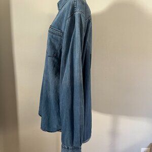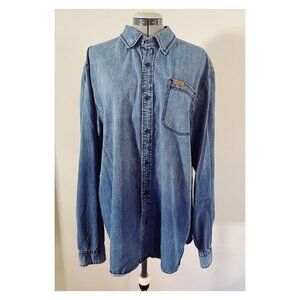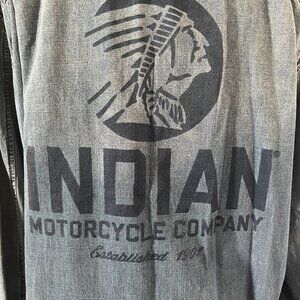 Indian Motorcyles clothing sz Large men's chambray denim shirt. Printed logo across the back with leather logo tags on shirt hem and pocket. Classic button-down styling with fold over collar and buttons at wrists. Front breast pocket. Shirttail hem.