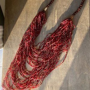 Attention-getting vintage beaded necklace with 39 strands of red glass seed beads with gold plated beads, attached to a row of wood beads and two flat shell bead accents. No clasp / pull over design. Late 20th Century. Great vintage condition - all strands are secure.