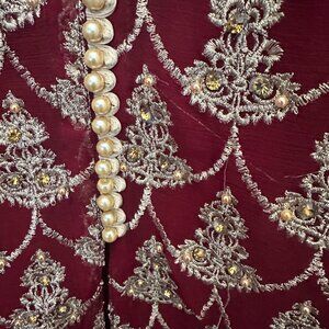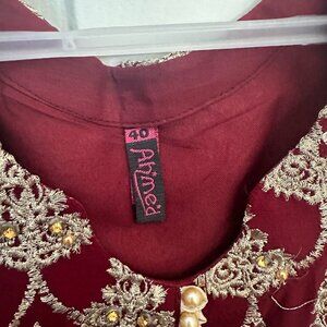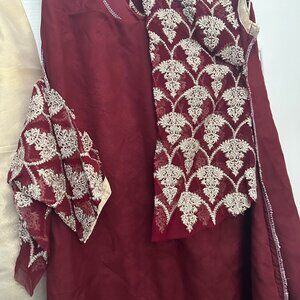 Brand new with Tags ,2 Piece Embroidered Maroon shirt and Beige/Golden pajama suit. Shirt is high/low style with all over embroidery design.