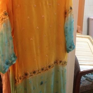 It's patayla shalwer in pure crabe fabrice n shirt in two tones worn only one time for 3 hrs it's brand new dress n duppta I'm two shades too n same work on duppta as shirt has it .also bck neckline is bit deep too .