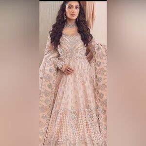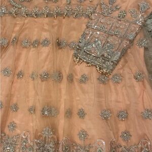 Stunning blush peech dress with intricate silver embroidery. Long sleeves add elegance. Perfect for special occasions.