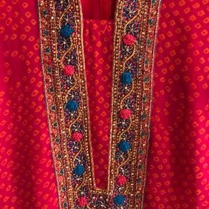 Bright magenta and tirqoise blue , very delicate embroidered on neck sleeves and bottom of shirt