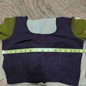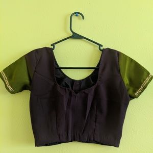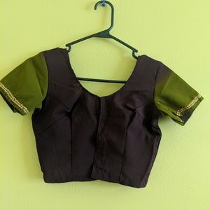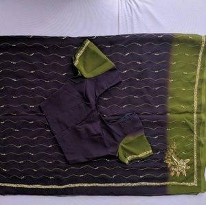 Brand New -A Dark purple and Green sari. Never worn. It comes with a stitched blouse. Beautiful sequins work. Blouse size 30-32". You can make it bigger size by opening up the inside of the blouse.