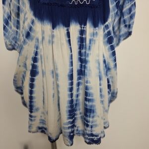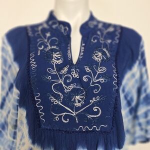 Beautiful blue and white tie-dye boho tunic top from Indian Tropical Fashions. Features intricate white floral embroidery on the chest and neckline. Lightweight and flowy with a handkerchief hem and scalloped lace trim. Made from soft 100% rayon, perfect for a relaxed, beachy, or festival look.